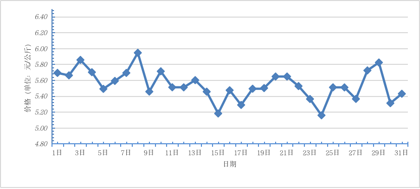 7月,全國(guó)重點(diǎn)監(jiān)測(cè)農(nóng)產(chǎn)品批發(fā)市場(chǎng)香蕉總交易量達(dá) 2.0萬(wàn)噸,同比下降74.3%,環(huán)比下降4.7%;總交易價(jià)值 12782.1萬(wàn)元,同比下降65.4%,環(huán)比下降11.5%。日平均價(jià)格最高為5.9元/千克,最低為5.2元/千克,全月平均價(jià)格為 5.5元/千克,同比上漲17.0%,環(huán)比下降8.3%(每日價(jià)格變化如圖)。