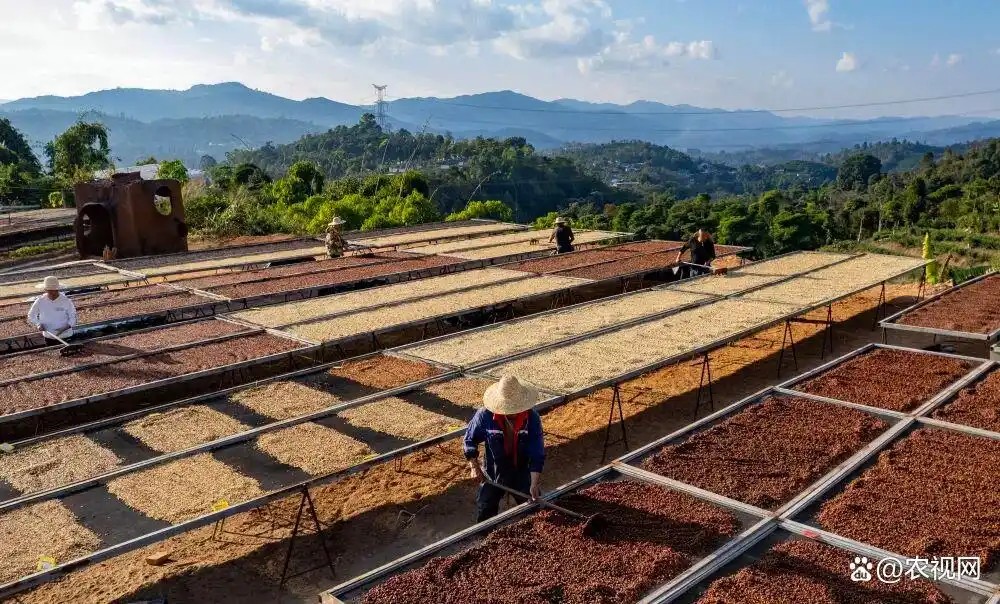 2025年1月7日,工人在普洱市思茅區(qū)一家咖啡莊園翻曬咖啡(無(wú)人機(jī)照片)。圖源:新華社