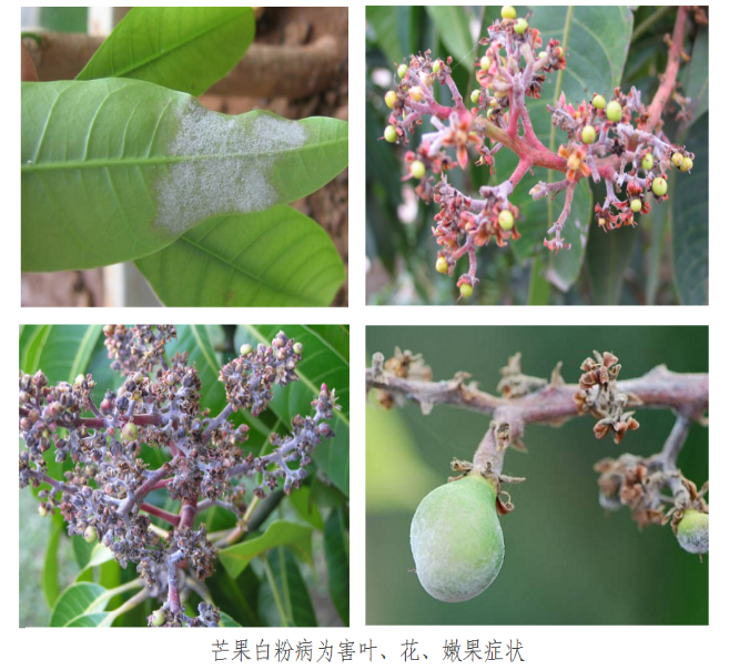 當(dāng)前,廣西、云南、四川、廣東、貴州、福建等主產(chǎn)區(qū)的芒果正處于花果期、果實(shí)膨大期等物候期,果園內(nèi)濕度高、氣溫低,芒果白粉病易于發(fā)生危害。開(kāi)始時(shí)該病害在葉片上產(chǎn)生白色粉狀物,逐漸在老葉上產(chǎn)生紅褐色病斑;侵染花穗時(shí),在花穗上產(chǎn)生白色粉狀物,小花穗褐色枯死,降低坐果率,落花落果嚴(yán)重;侵染幼嫩果實(shí)時(shí),白色粉狀物覆蓋幼果,果皮逐漸凹陷、粗糙,產(chǎn)生紅褐色銹狀物。