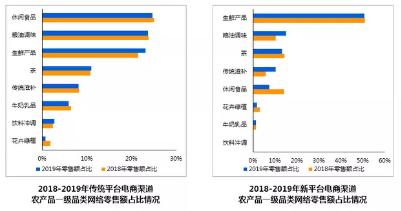 《報(bào)告》分析,傳統(tǒng)電商平臺(tái)中,農(nóng)產(chǎn)品網(wǎng)絡(luò)銷售前三大品類依次為休閑食品、糧油調(diào)味、生鮮產(chǎn)品,占比分別為25%、23.8%、21.5%。但以拼多多為代表的新電商平臺(tái)以及新零售渠道中,生鮮產(chǎn)品的網(wǎng)絡(luò)零售額占比均超過50%,而傳統(tǒng)電商平臺(tái)生鮮產(chǎn)品零售額占比不足25%。