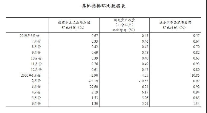 (2)根據(jù)季節(jié)調(diào)整模型自動(dòng)修正結(jié)果,對(duì)近一年來(lái)各期國(guó)內(nèi)生產(chǎn)總值、規(guī)模以上工業(yè)增加值、固定資產(chǎn)投資(不含農(nóng)戶(hù))、社會(huì)消費(fèi)品零售總額環(huán)比增速進(jìn)行修訂。修訂結(jié)果及2020年二季度GDP環(huán)比數(shù)據(jù)、2020年6月份其他指標(biāo)環(huán)比數(shù)據(jù)如下:2019年各季度及2020年一季度、二季度GDP環(huán)比增速分別為2.0%、1.2%、1.4%、1.3%、-10.0%、11.5%。