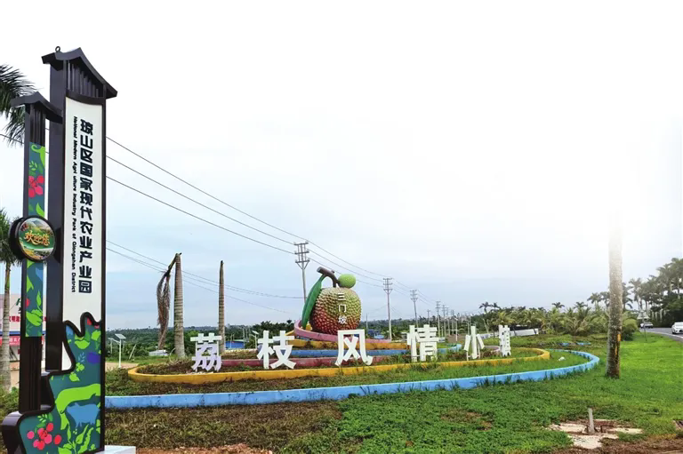 從海口出發(fā),沿223國(guó)道一路南行,在一片一眼望不到邊的荔枝園旁,一顆碩大的“荔枝”闖入眼簾,旁邊“荔枝風(fēng)情小鎮(zhèn)”幾個(gè)大字,讓人馬上意識(shí)到已抵達(dá)三門(mén)坡鎮(zhèn)。