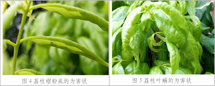 成蟲和若蟲以刺吸式口器在嫩梢的葉片上吸食為害,嚴(yán)重影響嫩梢的生長(zhǎng)。荔枝褶粉虱一般在葉背為害,造成葉內(nèi)卷,為害嚴(yán)重時(shí),葉面會(huì)出現(xiàn)黃色斑點(diǎn)。該蟲的排泄物可誘發(fā)煤煙病,影響葉片光合作用。荔枝褶粉虱主要發(fā)生在通透性差的密閉果園,在通風(fēng)透光良好的間伐果園,該蟲則為害較輕。而荔枝葉螨于葉面為害,葉片細(xì)胞被破壞而喪失葉綠素,造成葉片呈現(xiàn)黃白色小斑點(diǎn),嚴(yán)重時(shí)造成葉片卷曲、變褐至落葉。