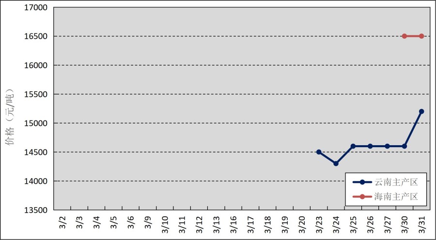 國內(nèi)主產(chǎn)區(qū):3月,國內(nèi)產(chǎn)區(qū)物候正常,下旬云南主產(chǎn)區(qū)進(jìn)入試割期,月末海南主產(chǎn)區(qū)逐步開割,云南、海南鮮膠乳(折干膠)月均價(jià)格分別為14629元/噸、16500元/噸。