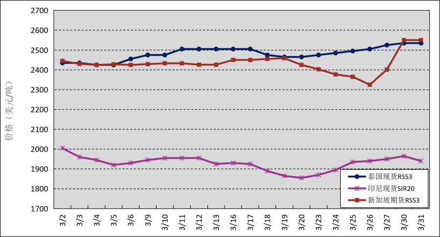 國外主產(chǎn)區(qū):3月,國外主產(chǎn)區(qū)價(jià)格呈小幅波動態(tài)勢。其中,泰國3號煙片膠(RSS3)平均價(jià)格2482美元/噸,環(huán)比增加229美元/噸,最高價(jià)2535美元/噸,最低價(jià)2425美元/噸;印尼20號標(biāo)準(zhǔn)膠(SIR20)平均價(jià)格1930美元/噸,環(huán)比增加28美元/噸,最高價(jià)2005美元/噸,最低價(jià)1855美元/噸。