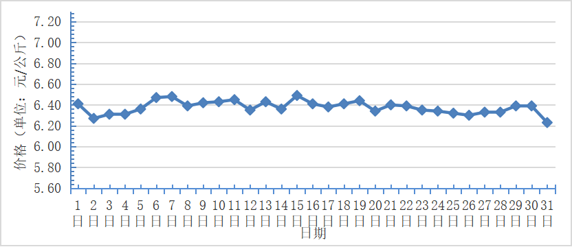 3月,全國香蕉銷售日平均價格最高為6.5元/千克,最低為6.2元/千克,全月平均價格為6.4元/千克,同比上漲8.5%,環(huán)比上漲3.2%(每日價格變化如圖)。