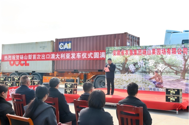 “這是繼去年碭山梨成功出口泰國后的又一次重要突破?!卑不帐∞r(nóng)墾集團市場總監(jiān)齊廣鵬在當日上午舉行的碭山梨出口澳大利亞啟運儀式上表示,碭山梨成功登陸澳大利亞,充分證明安徽農(nóng)墾農(nóng)產(chǎn)品品質(zhì)已達到國際一流標準,更為皖墾特色農(nóng)產(chǎn)品規(guī)模化、標準化出海樹立了新標桿。