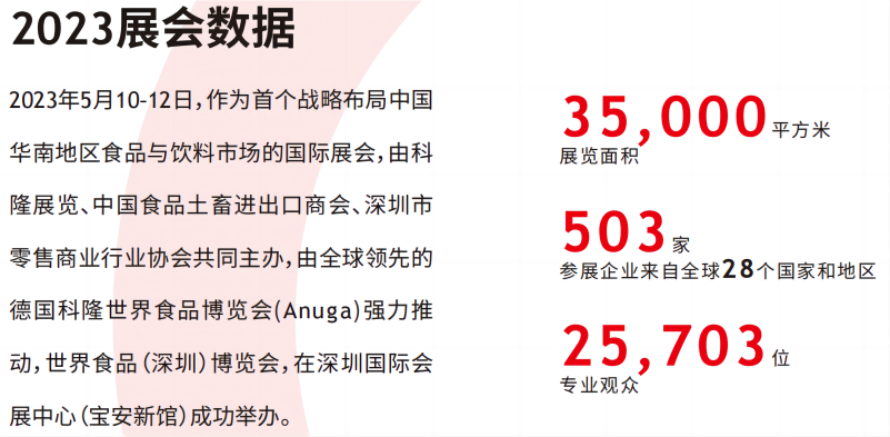 由德國科隆世界食品博覽會(Anuga)強力推動,科隆展覽、中國食品土畜進出口商會、深圳市零售商業(yè)行業(yè)協(xié)會共同主辦,ANUFOOD China 2023世界食品(深圳)博覽會于2023年5月10-12日在深圳國際會展中心(寶安新館)順利舉辦。本屆展會累計吸引25,703位食飲行業(yè)人士觀展,展覽總面積達(dá)到35,000平方米,參展企業(yè)數(shù)量達(dá)503家,來自全球近30個國家和地區(qū),涵蓋甜食及休閑食品、肉類、乳制品、精細(xì)食品、海產(chǎn)及冷凍食品、植物基及健康食品、咖啡與茶、飲料(酒精與非酒精)、食品與飲料技術(shù)、餐飲服務(wù)與技術(shù)等食品與飲料全產(chǎn)業(yè)鏈。同期還舉辦歐洲最大的烘焙咖啡行業(yè)盛會SIGEP在華子展——SIGEP China深圳國際手工冰淇淋、烘焙及咖啡展覽會。