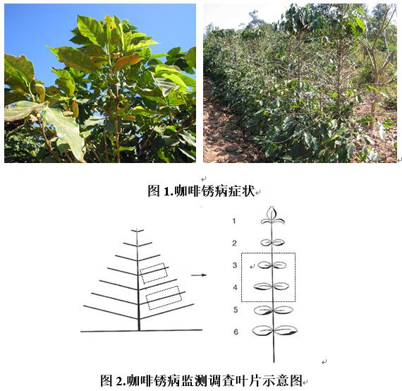 9月下旬開(kāi)始監(jiān)測(cè)咖啡葉片發(fā)病率,每個(gè)監(jiān)測(cè)點(diǎn)隨機(jī)選取30株咖啡植株,每隔15天調(diào)查一次咖啡銹病發(fā)病率。調(diào)查植株樹(shù)冠下層和中層一分枝的頂端順數(shù)第三或第四對(duì)葉片(如圖2),每株調(diào)查10片葉,共計(jì)調(diào)查300片葉。當(dāng)咖啡葉片背面出現(xiàn)銹斑(包括單個(gè)病斑)的病葉數(shù)達(dá)到總?cè)~數(shù)的5%以上時(shí)需噴藥防治。