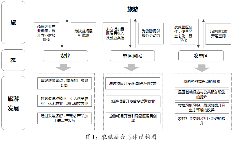 農(nóng)旅融合是農(nóng)業(yè)、墾區(qū)居民、農(nóng)墾區(qū)三者分別與旅游進(jìn)行深度結(jié)合,是一種新型的鄉(xiāng)村產(chǎn)業(yè)形態(tài)和消費形態(tài)。在充分發(fā)揮農(nóng)業(yè)生產(chǎn)功能的前提下,合理開發(fā)墾區(qū)生態(tài)資源、土地資源、勞動力資源等生產(chǎn)要素,開發(fā)休閑農(nóng)業(yè)、鄉(xiāng)村旅游、農(nóng)旅地產(chǎn)、康體療養(yǎng)等核心配套項目,使農(nóng)墾資源與旅游產(chǎn)業(yè)互相促進(jìn),相輔相成,共同加快農(nóng)墾供給側(cè)結(jié)構(gòu)性改革,繁榮墾區(qū)經(jīng)濟(jì)。詳見圖1。