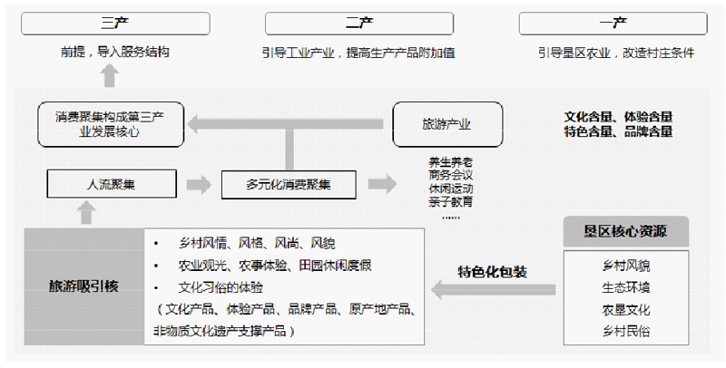 農(nóng)墾系統(tǒng)的“321”全產(chǎn)業(yè)鏈發(fā)展模式,強(qiáng)調(diào)三產(chǎn)之間的互動效率和產(chǎn)業(yè)能力提升。這一模式以墾區(qū)核心資源的分析挖掘為起點,通過對資源的特色化、產(chǎn)品化包裝形成旅游產(chǎn)業(yè)的吸引核,以聚集人氣,形成旅游引導(dǎo)的消費聚集,并引致消費產(chǎn)業(yè)的就業(yè)供給側(cè)聚集,形成以旅游產(chǎn)業(yè)為核心的三產(chǎn)服務(wù)結(jié)構(gòu),進(jìn)而引導(dǎo)加工產(chǎn)業(yè)發(fā)展,帶動墾區(qū)農(nóng)業(yè)發(fā)展方式轉(zhuǎn)型升級。